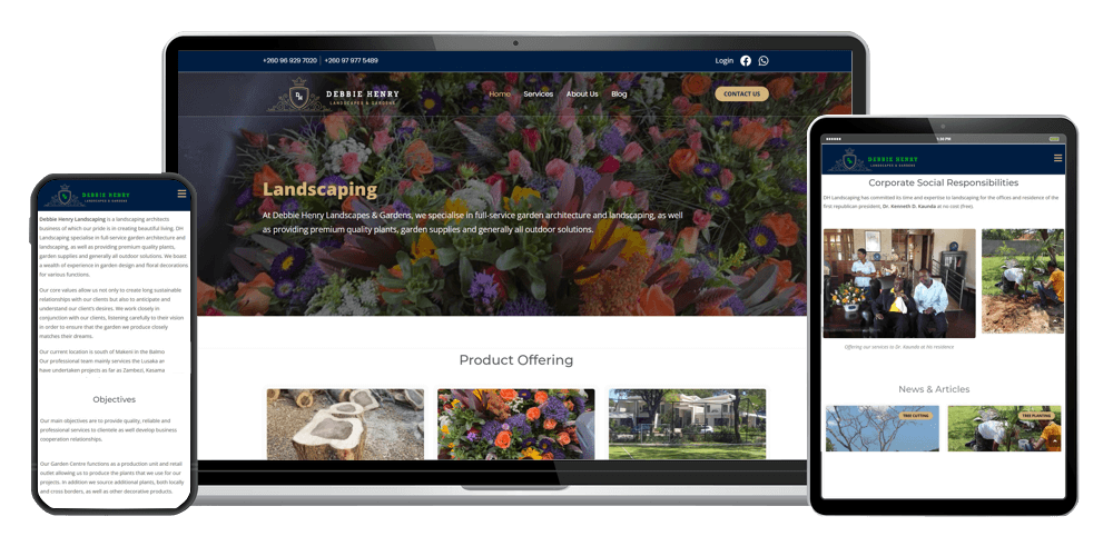 We partnered with Debbie Henry Landscaping, a leading Zambian landscaping and gardening company, to create a compelling online presence. Recognizing the importance of showcasing their beautiful and expertly crafted outdoor spaces, we designed a visually rich website that highlights their diverse range of services.