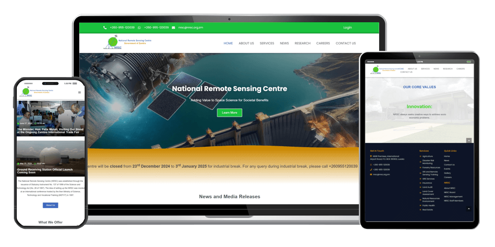 Our team designed a visually appealing website with a clean and modern design for National Remote Sensing Centre, a Zambian Centre of Excellence in remote sensing and GIS products and services under the Ministry of Science and Technology a Centre of Excellence in remote sensing and GIS products and services.